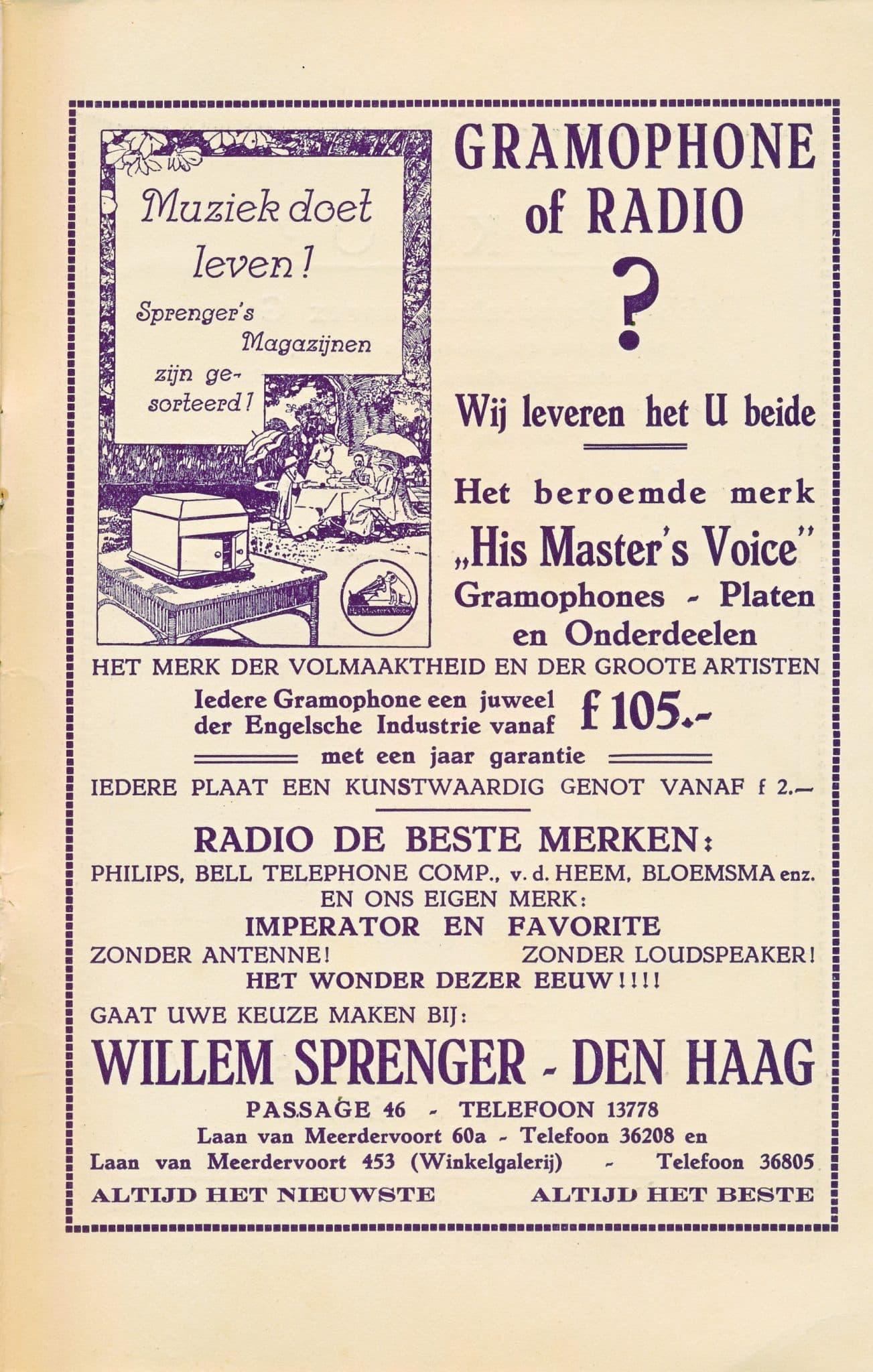 Zomer 1906 Willem Sprenger voert de zaak in de Passage nu op eigen naam. Er worden ook platenspelers en platen van het Engelse label Gramophone And Typewriter Ltd. Verkocht.