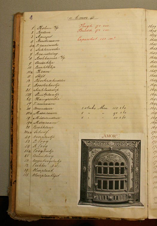 Telkens werd een nieuw model van haarden toegevoegd. Per pagina werden de diverse onderdelen vermeld, soms tot ver over de 40. Later toen er ook gedrukte, meer publiekscatalogi verschenen, werd hieruit een plaatje geknipt en in deze catalogus bijgeplakt. Het is vermoedelijk een overzicht voor intern gebruik binnen het bedrijf. Zo werd nauwkeurig bijgehouden welke onderdelen er moesten worden vervaardigd van een specifieke haard.
