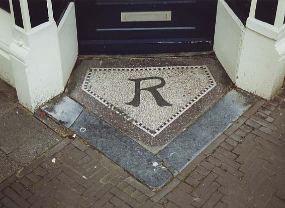Lopend over deze R betrad men één van de winkels, waar Rademaker zijn chocolade producten en natuurlijk de echte Haagse Hopjes verkocht. De letter R is uitgevoerd in terrazzo.