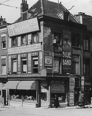 Naast de bescheiden letter R was de gevel rond 1920 flink voorzien van reclame. Behalve de firma Rademaker prezen ook diverse andere firma’s hun waren luidkeels aan.