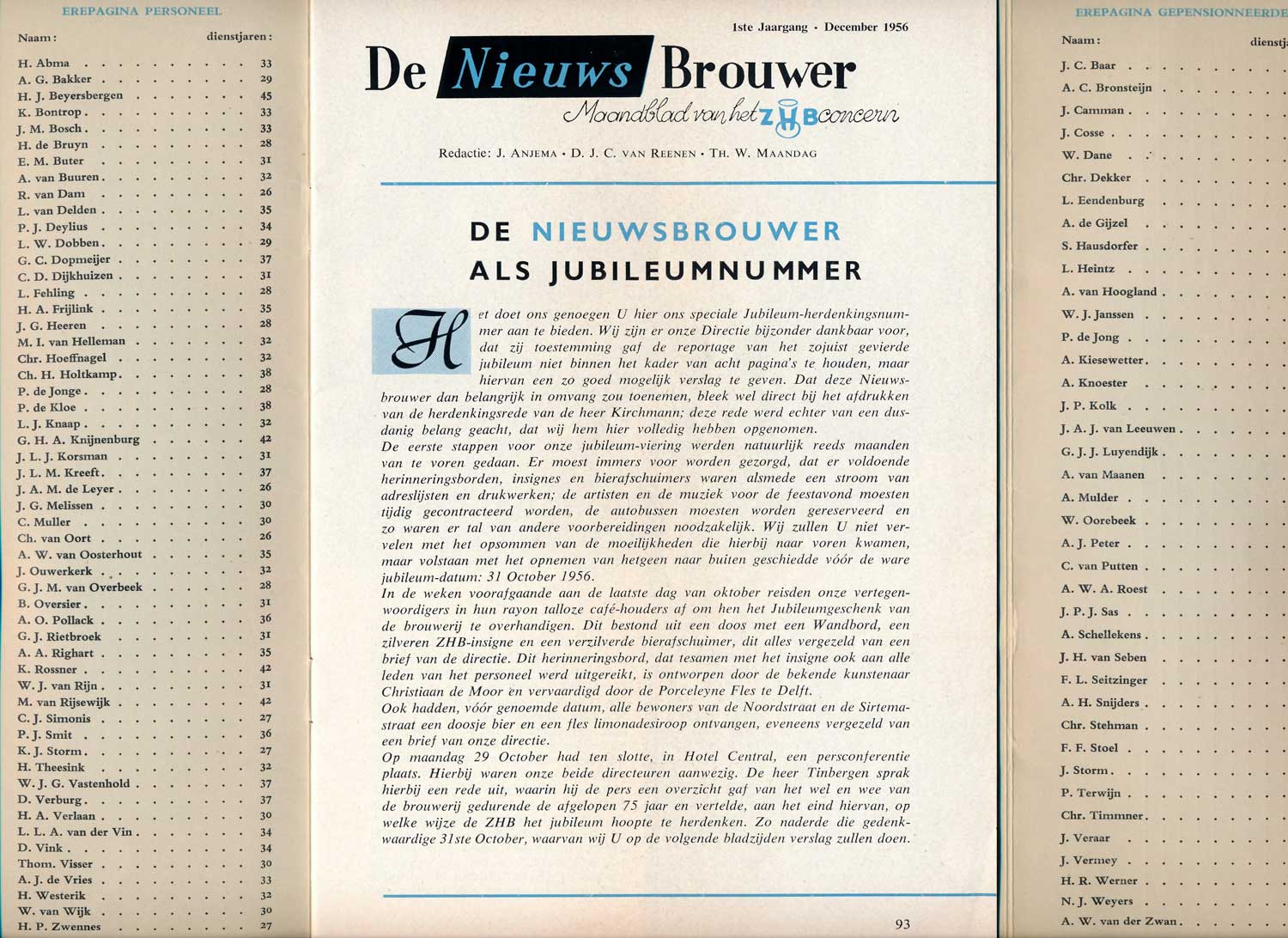 Al in het eerste jaar verschijnt een jubileumnummer van de Nieuwsbrouwer. Het jubileum gaat niet over het tijdschrift zelf, maar juist over het bedrijf dat in 1956 precies 75 jaar bestaat. Het decembernummer staat daarom geheel in het teken van de festiviteiten, de toespraken en ook de cadeau’s die aan het bedrijf en de directeur worden overhandigd. Het personeel schonk twee bronzen deuren voor het hart van de brouwerij, het Brouwhuis. De directeur Kirchmann wordt op de dag van het feest 31 oktober geridderd door de wethouder van Economische Zaken, J. van Aartsen. Andere festiviteiten als een receptie, de feestavond in Treslong en een boottocht voor de agenten komen verder nog aan bod. Vooral de rede van Kichmann, die integraal is opgenomen, is interessant van vanwege de vele historische feiten die passeren.
