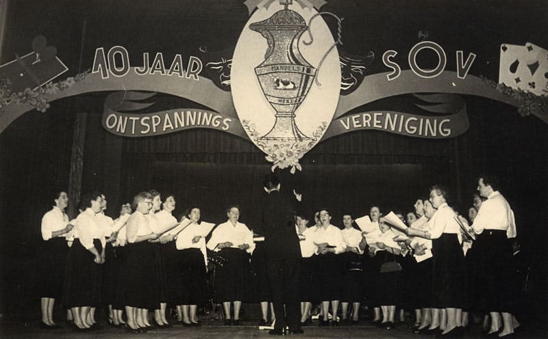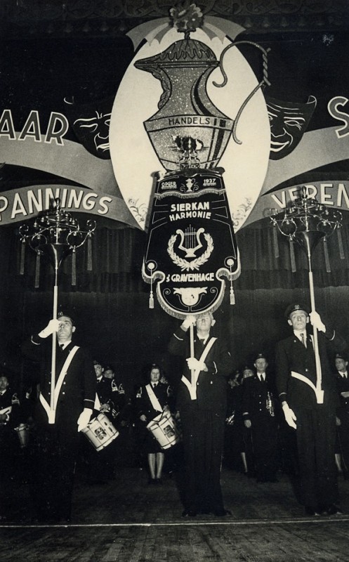 “Ja, om beurten moesten ze dat organiseren. De Sierkan heeft dat georganiseerd in 1954, altijd op hemelvaartsdag, want dat was de enige dag dat de Sierkanmensen vrij waren. Voor die tijd hadden we geeneens vakantie, voor de oorlog niet. Bij elk jubileum waren wij op straat. Als je de boekjes leest hoeveel jubilarissen er waren. Wij waren voortdurend op straat. Dat gebeurde allemaal om etenstijd. Hoe ik het allemaal voor elkaar heb gekregen ik snap het niet… en oefenen anders kreeg je weer een standje van de dirigent van gooi dat ding dan onder de tram als je niet studeert, want zo ging dat vroeger. Dan liep je soms huilend weg. We gingen ook op concours, nou, nou, nou… op vrachtwagens, op ijzeren bakken heb ik gezeten, nou, nou hoe ik het allemaal doorstaan heb en dan in een weiland lopen met een klarinet in kuilen of door de stront. Zo ging dat vroeger.”