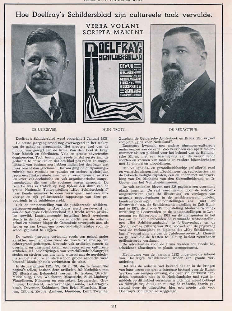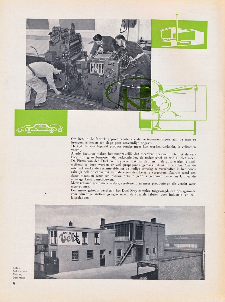 Het bedrijfsblad van de verffabriek Van den Doel & Fray kwam voort uit het reclamebeleid van de firma. Met de aanstelling in 1919 van de heer J.W. Goudsbloem als reclameman werd de eerste stap hierin gezet. Hij begon met het maken en plaatsen van advertenties, die na verloop van tijd steeds groter werden. Ook bedacht hij pakkende namen voor de Doelfray producten, zoals Dubbeldroog voor siccatief, Kwiek voor afbijtmiddel en Rono voor plamuur, een afkorting van Rolt Nooit. Soms werd hier een prijsvraag voor uitgeschreven, zoals bij Japanlakken. Tegelijkertijd ontstond meer aandacht voor verpakking en de etiketten op de verfblikken en circulaires, die informatie gaven over de Doelfray producten. Bij bijzondere feesten nam het bedrijf ook deel in optochten met een reclamewagen. In 1925 verscheen de eerste full-page reclame in de schildersvakbladen. In die tijd ontstond ook het bekende Doelfray beeldmerk met de ooievaar met de kwast in de bek.