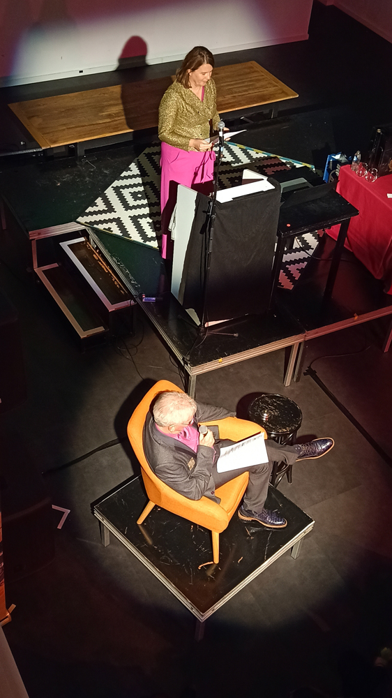 De quizmaster en de Haagse ‘Maarten van Rossum’ als jurylid op zijn troon.