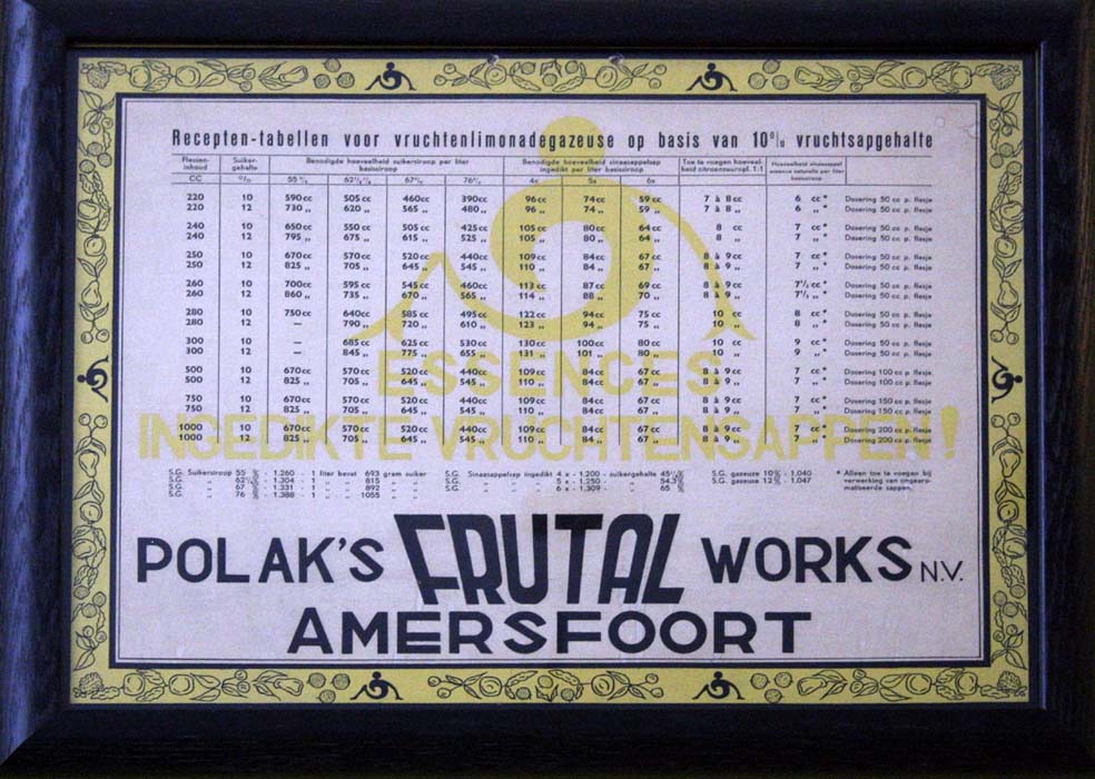 “De essences kwamen van Polak, dat was in prachtige flessen [Polak Fruital Works, Amersfoort tegenwoordig gevestigd in Barneveld]. Mijn moeder kreeg ook tegen kerst, of ik weet niet precies wanneer, parfums daar van. Het waren eigenlijk van die apothekersflessen. Daar zaten de grondstoffen in, de essences. In grote ketels werd alles gemengd, dat stond dan op een soort pit in de keuken. Op diezelfde pit werd ook water gekookt om flessen te spoelen. Die pan werd dan, we hadden suikerbalen uit Dinteloord… Dan werd er suiker in gegooid in dat water. En dan riep je ‘suiker kookt’ en dan kreeg je een hele zoete geur door het huis en dan werd dat gemengd. Dan kwamen er grote ketels en dan hadden we een bok, waar de machine stond, althans in de Koningstraat. Dan stond er een houten bok en daar werd die siroop op gehesen, dat werd gesjouwd door m’n broers. En dan moest je bij de cider, die kleur doen, wat naar die roze snoepjes, die perendrups smaakt, daar moest je urenlang in roeren. Daar zat iets in dat eronder moest blijven, dat leek wel een beetje olieachtig en dat moest je steeds door de siroop roeren. De koolzuur kwam uit die staven, dat werd meteen gemengd in die machine die rond draaide, dus dan was het product klaar. Een soort slang zat er aan met een steen eraan en er zat een soort elastiekje om, want er mocht geen lucht bij komen, anders gingen de flessen knallen. Zodat er geen lucht in de slang kwam, op een gegeven moment moest je het scheef houden en dan ho roepen, wel zo laat mogelijk, anders ging m’n vader mopperen, want dan was de siroop natuurlijk verspild, als je te vroeg riep. Het was niet heet, die siroop was koel als het gebruikt werd. Dat was afgekoeld. Ja en dan kwam het in flesjes en dan in kratten.”
