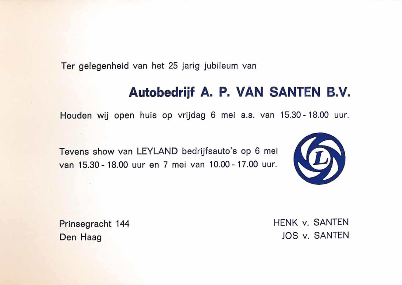 Op 13 maart 2017 interviewden we de heer H. van Santen, voormalige eigenaar/directeur van garagebedrijf A.P. van Santen BV aan de Prinsegracht in Den Haag. Een bedrijf dat voortleeft in AutoHaag Zeeuw en nu gevestigd is aan de Zonweg in de Binckhorst. Aan de hand van een aantal oude foto’s van het bedrijf aan de Prinsegracht start het gesprek: