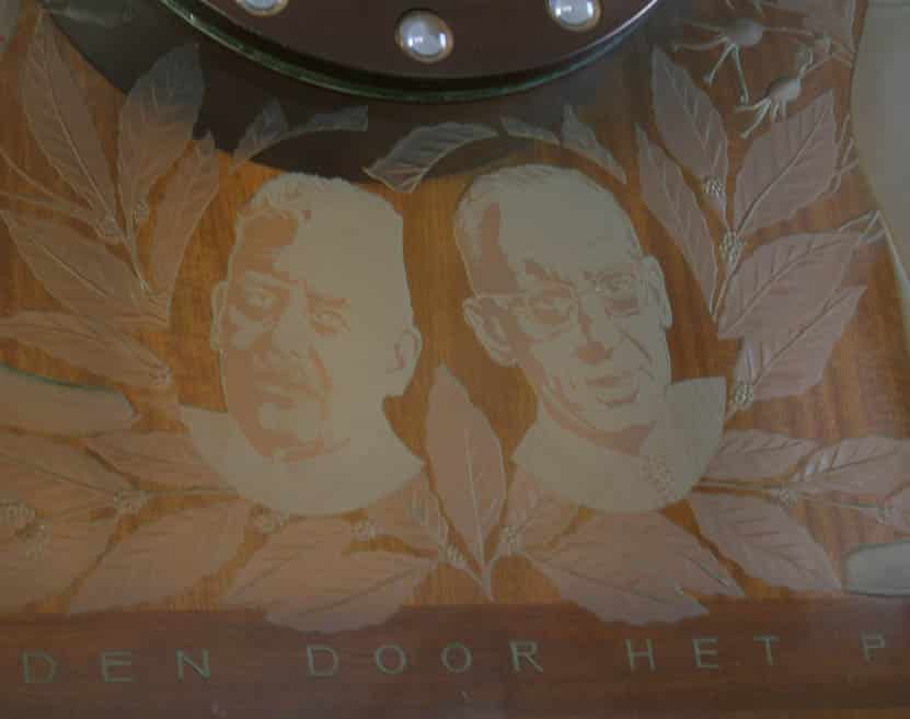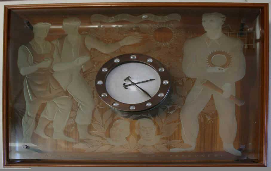 Het gedenkraam werd vervaardigd door de glasfabriek Leerdam (rechtsonder gesigneerd) en bestaat uit een glasplaat met gezandstraalde voorstelling met in het midden een klok en is geplaatst in een houten bak. Het raam werd door het personeel aan de directie aangeboden ter gelegenheid van het 40-jarig jubileum van het bedrijf.