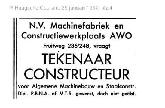 “Daarna kwam de Netam, daar bouwden we opleggers, aanhangers, van die zij-kippers. Ik spring een beetje van de hak op de tak, maar goed ik kwam via allerlei, failliete bedrijven, een bedrijf als Netam ging dan failliet en hoe moest je dan verder. Gelukkig was het zo, je liep als het ware naar de overkant en je ging praten en je had zo weer werk. Dus ik ben eigenlijk via allerlei omzwervingen bij diverse constructiebedrijven terecht gekomen en toen kwam ik op een gegeven moment bij HACAS. Dat was een klein constructiebedrijf in Kwintsheul. Daar heb ik een aantal jaren gewerkt, dat is ook failliet gegaan, het is een soort achtervolging van mij, faillissementen. Ik ben eigenlijk via HACAS in contact gekomen met de firma AWO, Aarssen, Weggelaar en Overwijn en dat was een bedrijf van Van den Berg in Den Haag. Want meneer Piet van den Berg, die had een zus en zij was directrice van AWO”.