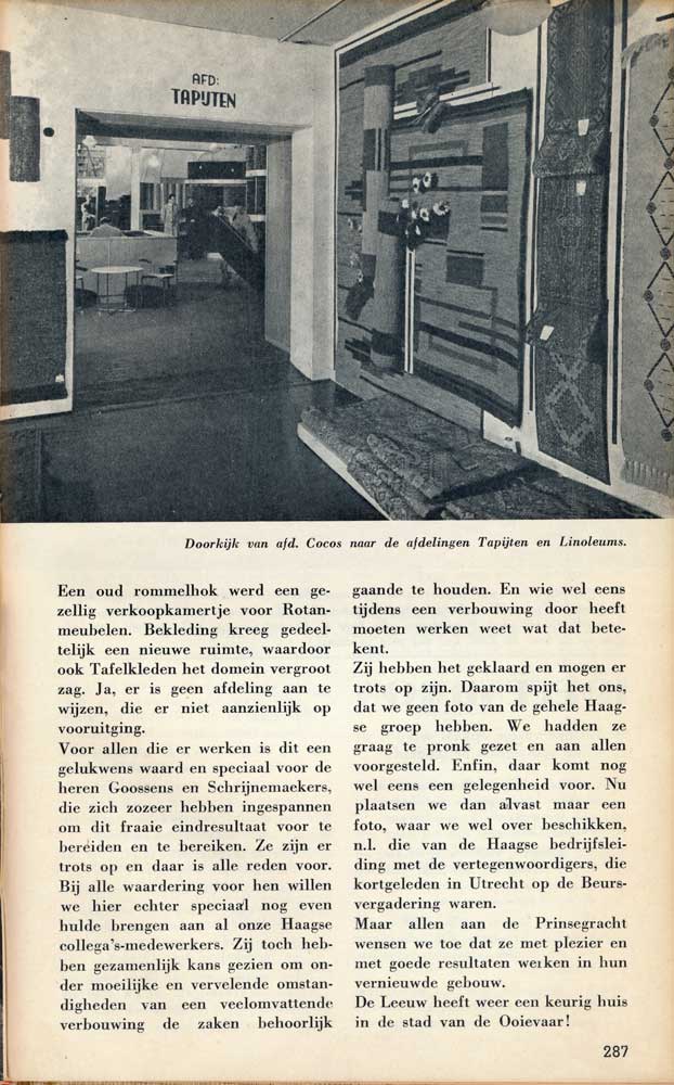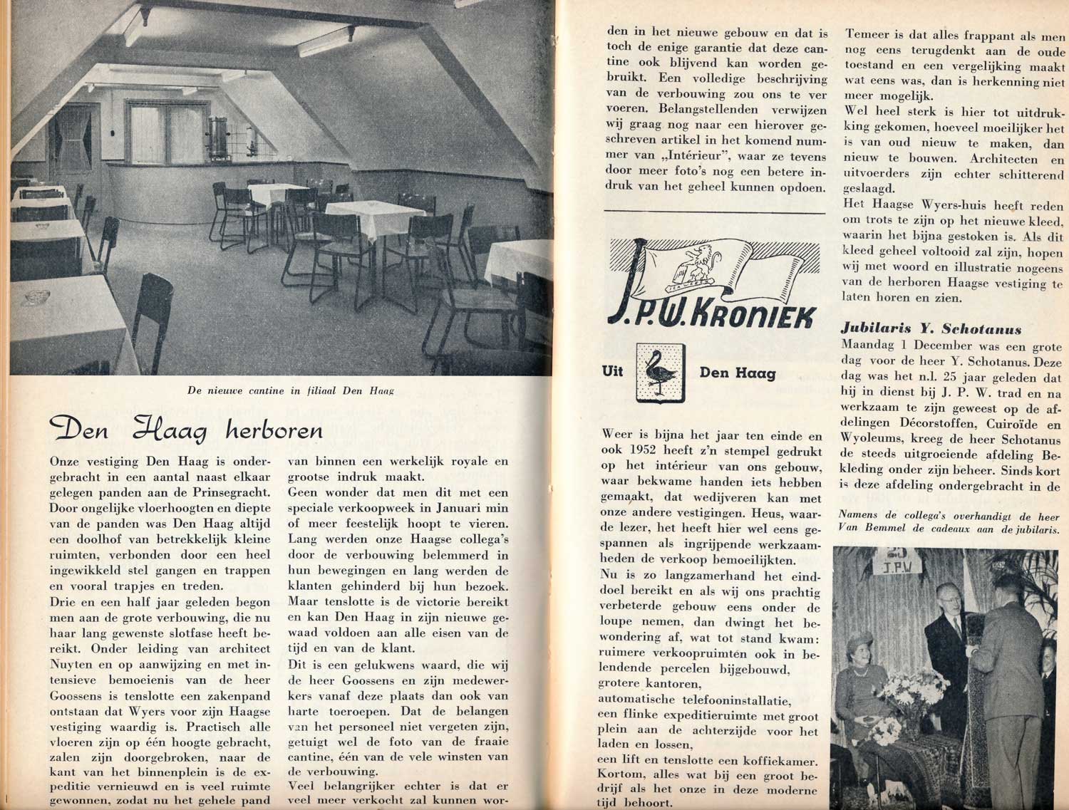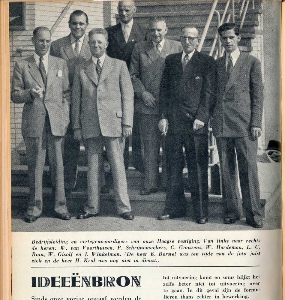 Er is uiteraard ook aandacht voor wat er in het bedrijf aan ontwikkelingen plaatsvinden. Zo kwam de verbouwing tussen 1950 en 1953 van het Haagse filiaal uitgebreid aan de orde met foto’s van de nieuwe inrichting in het pand aan de Prinsegracht. Ook de instelling van de ‘bedrijfskern’ in april 1946 in de Amsterdamse vestiging en het vervolg hierop in de andere vestigingen kwam uitgebreid in beeld. In januari volgde de Ondernemingsraad waarin iedere vestiging één afgevaardigde naar toe kon sturen. Het reglement van de OR werd ook in het blad besproken.