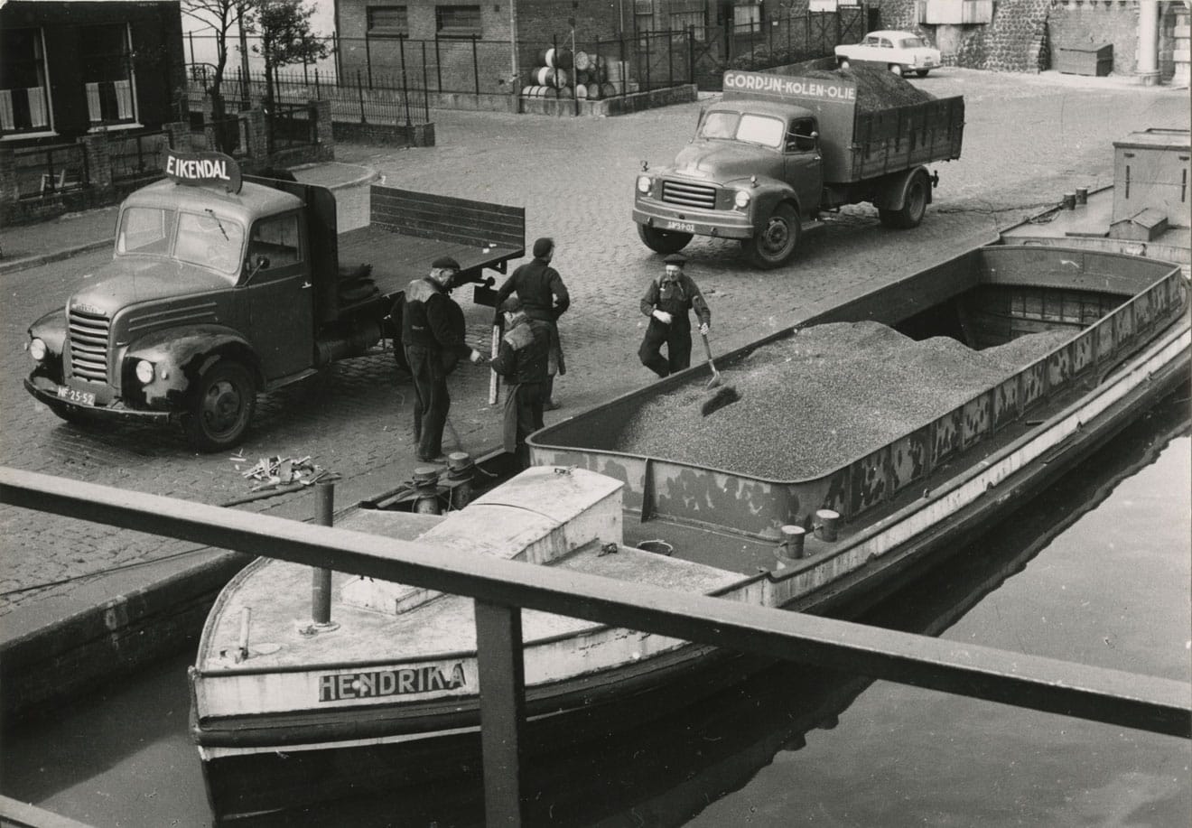“Ja, bij de Lekstraat had je dat vroeger. Je had Van Gend & Loos vooraan en achteraan zaten ook diverse kolenboeren. Vlakbij het emplacement [in Voorburg] zat ook een kolenboer Eigen Hulp en die kon zo vanuit de wagon op eigen terrein lossen. Mijn opa loste nog met de hand met een kruiwagen. Toen de eerste kieper kwam, ging de vlag uit”.