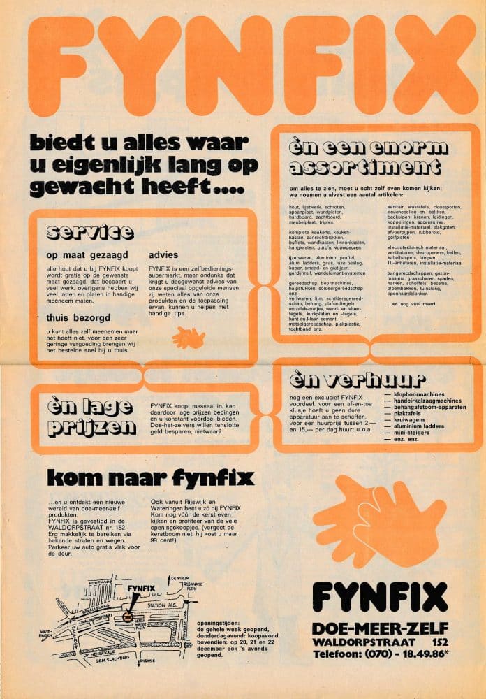 “We zijn in 1972 in de Waldorpstraat begonnen met doe het zelf, in de oude haardenfabriek van Vulcana, dat is toeval. Dat was een van de eerste grote zaken en dan praten we over 800 m². Het is nu allemaal 8.000 of nog groter. We noemden het ook 8 speciaalzaken onder één dak. Met verf, behang, elektra, sanitair, hout, keukens en kasten, bouwmateriaal, misschien ben ik er eentje vergeten. Dat was de FijnFix”.