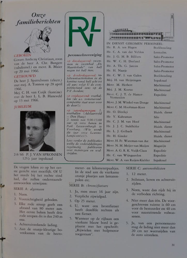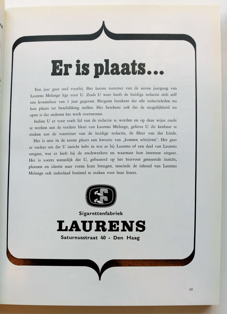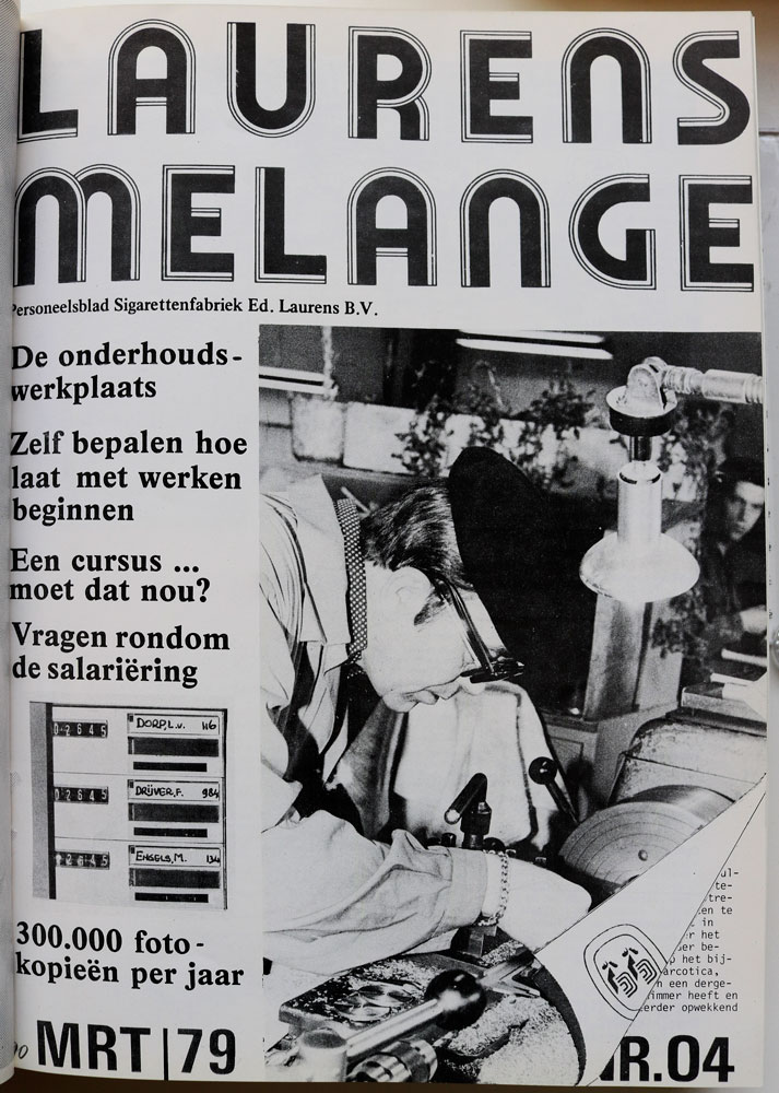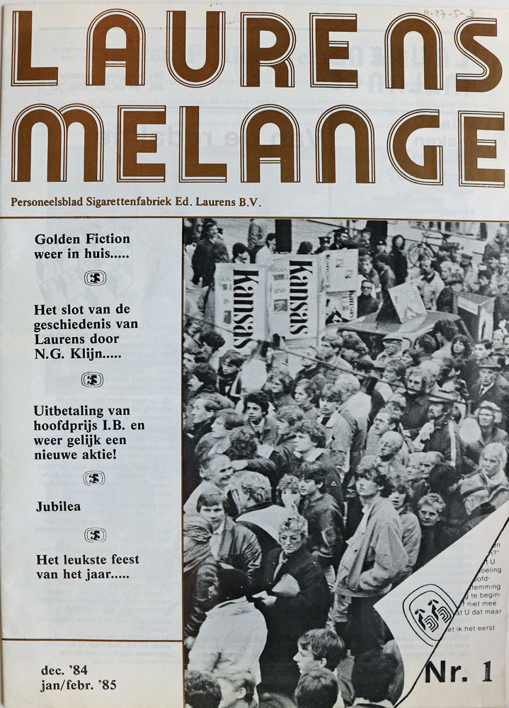 Het bedrijfsblad van de Laurens fabriek verscheen voor het eerst eind 1965 en werd gepresenteerd als het ‘Personeelsorgaan N.V. Sigarettenfabriek Ed. Laurens ‘L Khédive”te ‘s-Gravenhage’. Het was redelijk omvangrijk met zijn 32 pagina’s en voorzien van veel foto’s. Het formaat was aanvankelijk 13,3 bij 25 cm. Later werd dit meer genormaliseerd en kwam het tot A4-formaat.