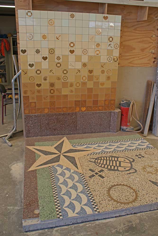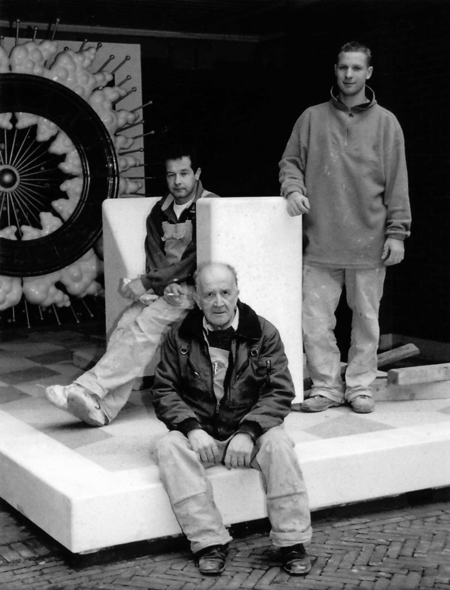 “Ja, mijn oom was toen alleen maar aan het rijden, het materiaal brengen ging de hele dag door. Een paar man waren aan het smeren en een paar man waren aan het schuren en mijn oom was alleen maar aan het materiaal aanvoeren. Het CBS in Voorburg, daar hebben we ook al die vloeren gedaan. Ook klinkertjes en stenen voor de parkeerhavens. Later kwam de kunst erbij en kwam de keramiek erbij van Struktuur 68. Keramiek van de Porceleyne Fles hebben we ook veel voor gedaan. En dan leer je daar ook die mensen kennen. Van de Porceleyne Fles, daar komt Struktuur 68 vandaan. Jacques van Gaalen en Henk Trumpie, die waren eerst werkzaam bij de Porceleyne Fles en ze hadden een eigen metselaar, maar die had altijd problemen. Ze zochten eigenlijk een nieuwe metselaar en ze vroegen aan mijn vader, kun je ook metselen? En mijn vader zei ja, dat kunnen wij. Hij had het nog nooit gedaan, maar hij dacht, weer een klant erbij. En dat groeide gewoon en we hadden een hele goede verstandhouding met hen en ook met kunstenaars en dan ga je grenzen verleggen. Van wat is mogelijk, kunnen we dat maken? En samen ging je steeds een stapje verder, ging je meer op het randje lopen.”