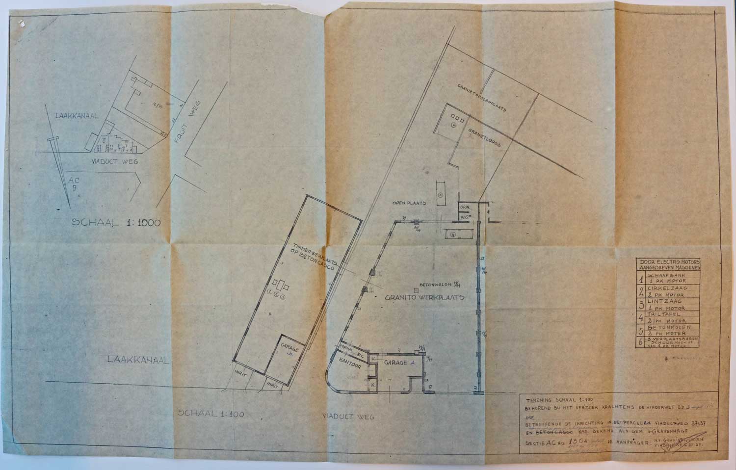 “Ik denk zo rond 1925 aan de Viaductweg. Langs de kade lagen twee boten. De eerste was de timmerwerkplaats. Daarachter hadden we nog een boot liggen, ook zo’n grote en daar lag zand en grind. Daar was een kelder voor houten binten opslag. Op de kade was de werkplaats en een kantoor en een garage voor een personenauto. Daarachter was het schuurgedeelte en het graniethok. Dat graniet kwam allemaal met de trein aan in zakken en dat werd dan daar losgegooid. Boven de werkplaats was het woonhuis. Er was een portiek met vier woningen, de hele familie woonde er, op dat portiek. Mijn vader woonde daar, mijn opa en nog twee broers van mijn vader woonden er. Die drie broers zaten allemaal in de zaak.”