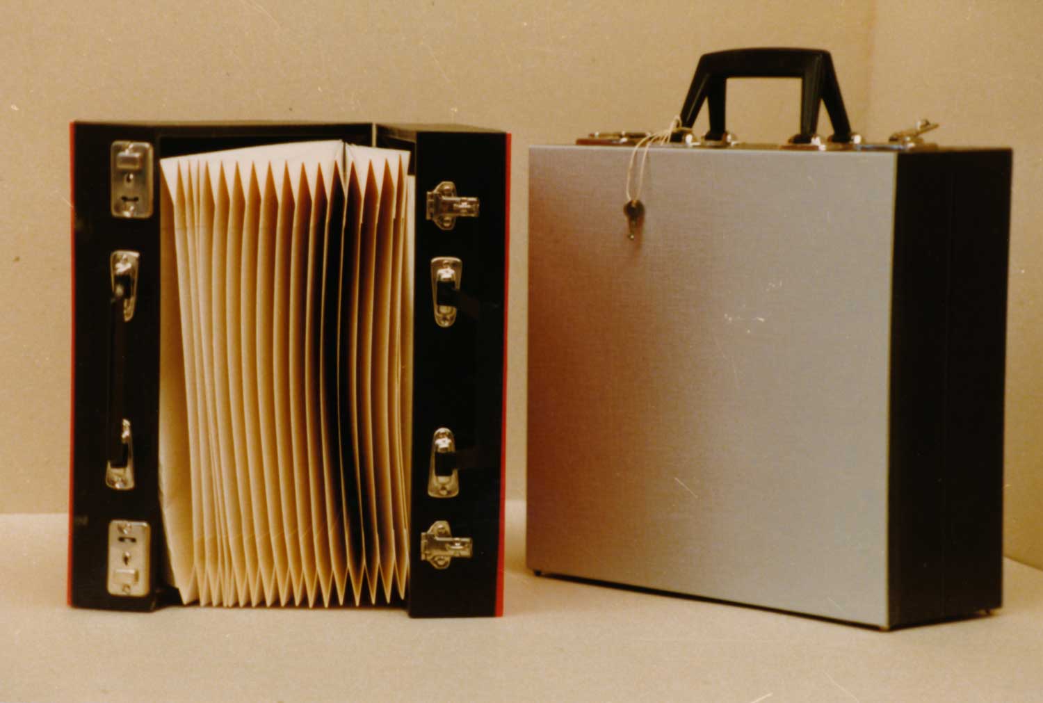 “Nou daar werden de eerste kistjes gemaakt, die overtrokken werden met een velletje zelfklevend kunststof. Het was gewoon een heel dicht kistje en als dat klaar was, dan werd het open gezaagd en dan had je twee helften. Die helften moesten altijd bij elkaar blijven, want dan wist je dat het paste. Als ze doorgezaagd waren, dan werden ze genummerd en dat zie je ook in die platenkoffers nog staan. Daar ging dan zo’n harmonica in, die door thuiswerkers gemaakt werden. De houten kistjes werden beplakt met een folie. Mijn moeder heeft duizenden koffers staan plakken indertijd. Het was allemaal hout en indertijd had je ook nog een hardboard fabriek, de firma Novee in Hoogezand en alle gebroken stukken hardboard, die kocht mijn vader op voor een heel zacht prijsje, want hij had eigenlijk altijd maar kleine stukjes nodig.