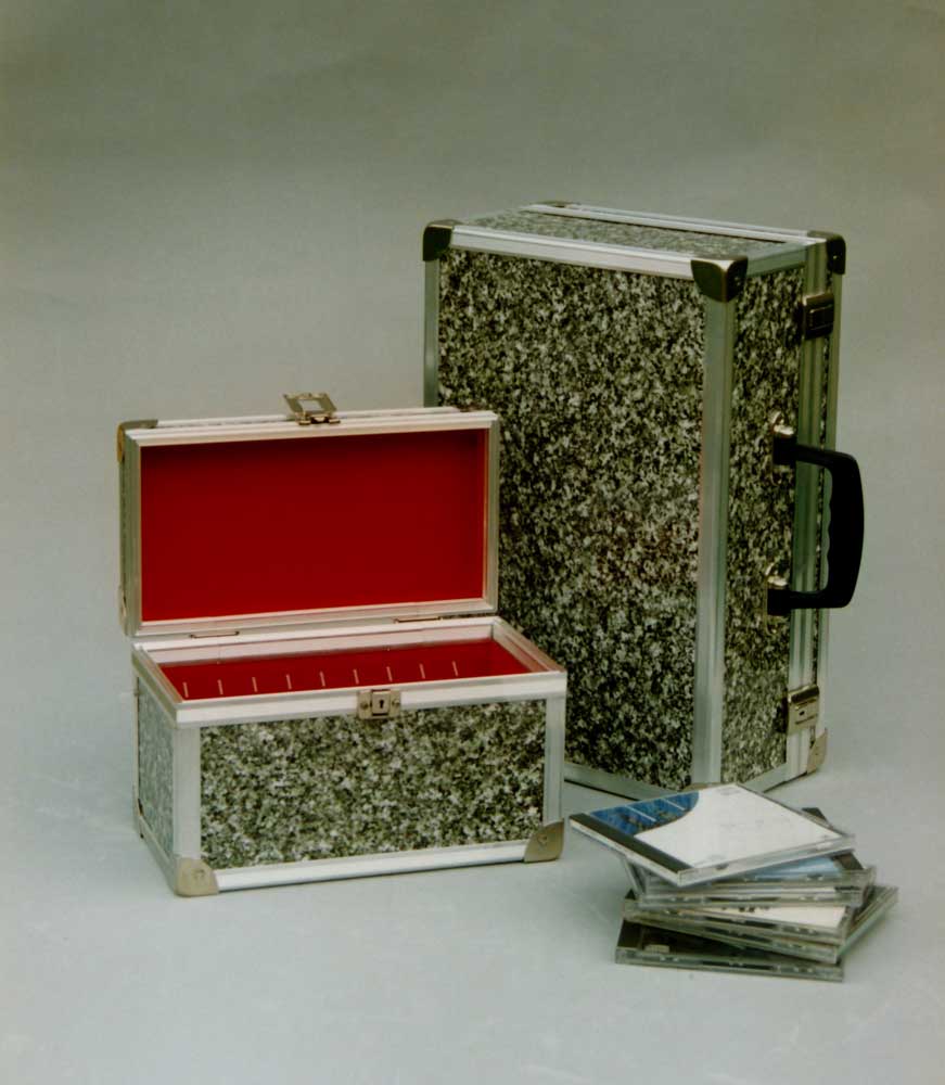 “Omdat dat product geschikt was voor andere doeleinden. De koffers die toen in die tijd gemaakt werden waren uitsluitend geschikt voor de geluidsdragers markt. In 1988- 89 heb ik die nieuwe aluminium koffer ontwikkeld, waarbij ook dat houten kistje gebruikt werd, zij het van een stuk dunner hout. Maar daarentegen werd het weer verstevigd rondom door aluminium. Dit hele systeem is eigenlijk het legosysteem onder de koffers. Dit is ook door anderen vele malen gekopieerd. Ik was de eerste met dit idee. Alleen er moesten matrijzen gemaakt worden om die kunststof onderdelen te maken en dat geld, dat had ik niet, dat kostte ronde de 500.000 gulden toen. Dat was een behoorlijk bedrag, dat geld heb ik bij elkaar weten te sprokkelen door deze koffer. Dit is gewoon rechttoe rechtaan afgezaagd en dan werden die hoeken ingezaagd, daar had je geen speciale matrijzen voor nodig. Zo zag ik de handel zitten en toen had ik dit ontwikkeld en toen dacht ik, ja, wacht even, nou ga ik weer de boer op naar andere bedrijven als alleen maar de platen- en CD-winkels.”