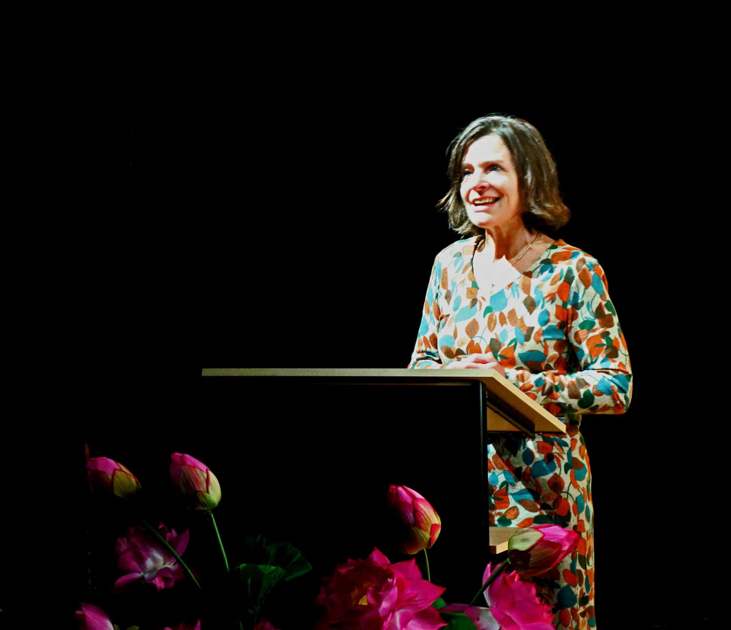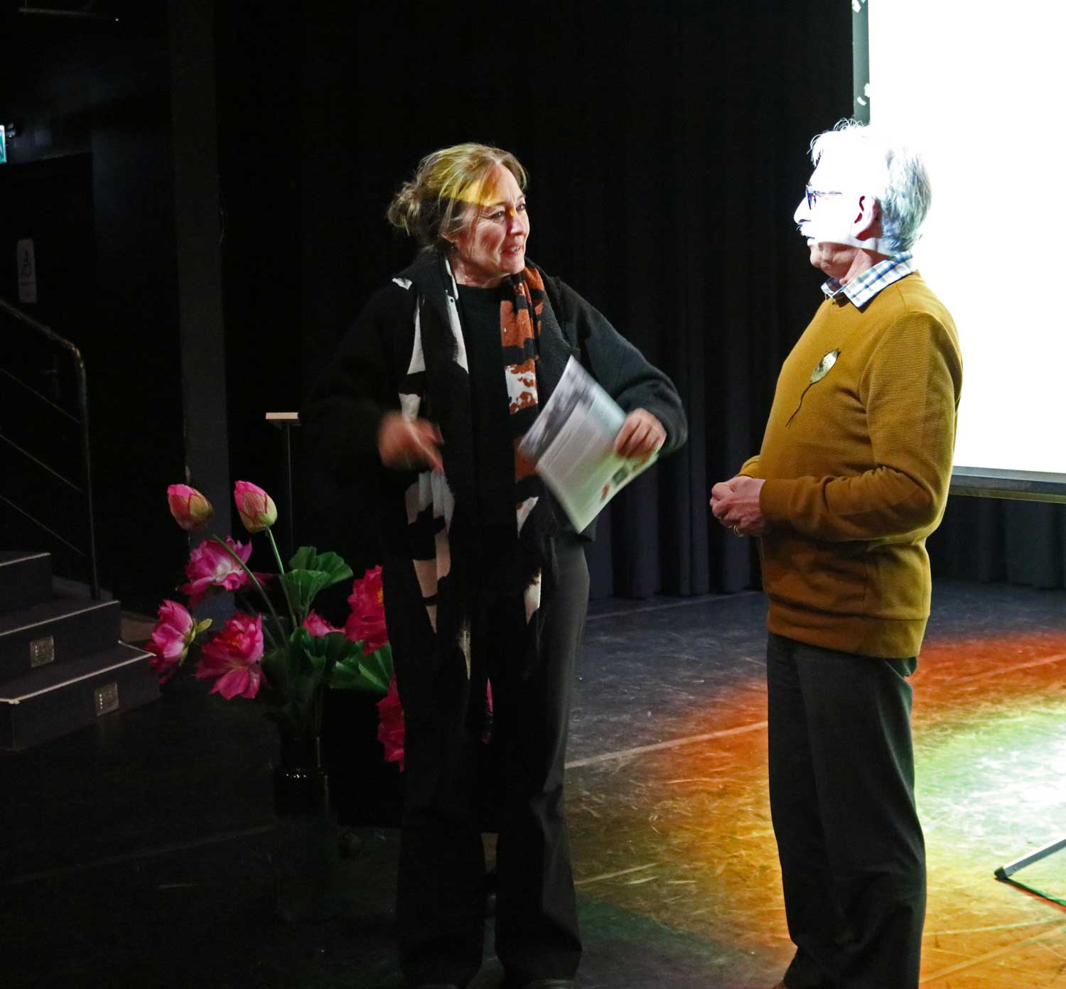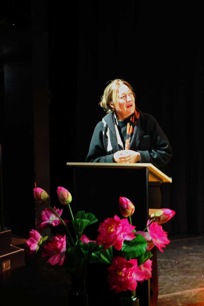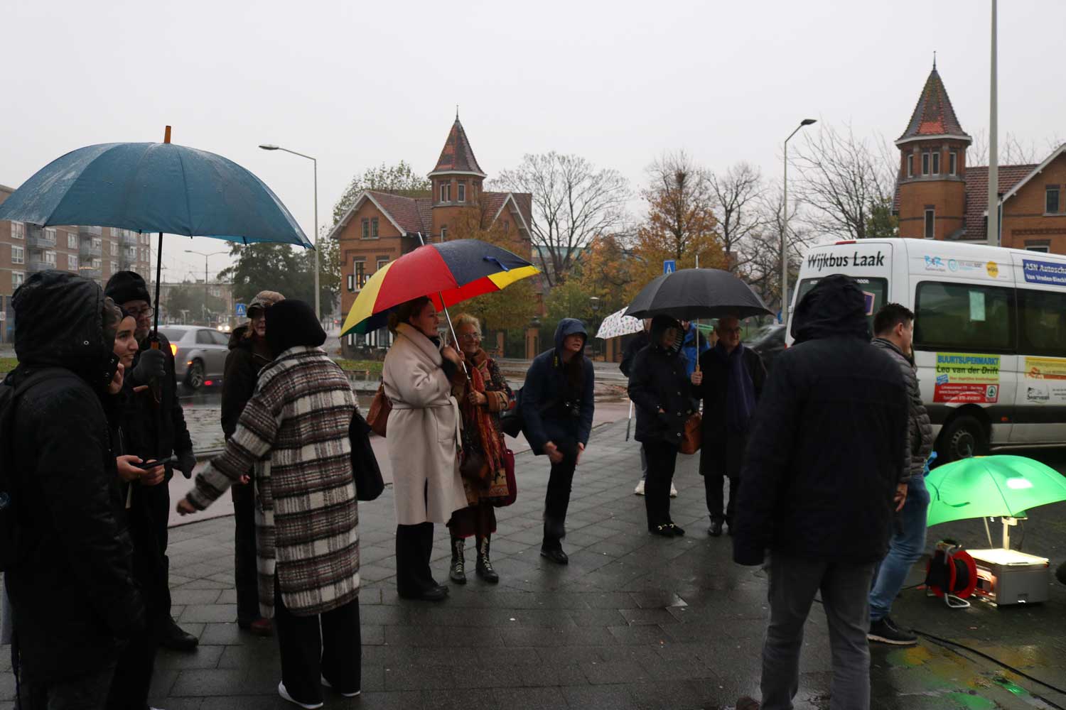 Na de onthulling van het kunstwerk en het laten zien van een projectie van de dichtregels op het brugwachtershuisje ging het gezelschap naar het Laaktheater verderop in de wijk.