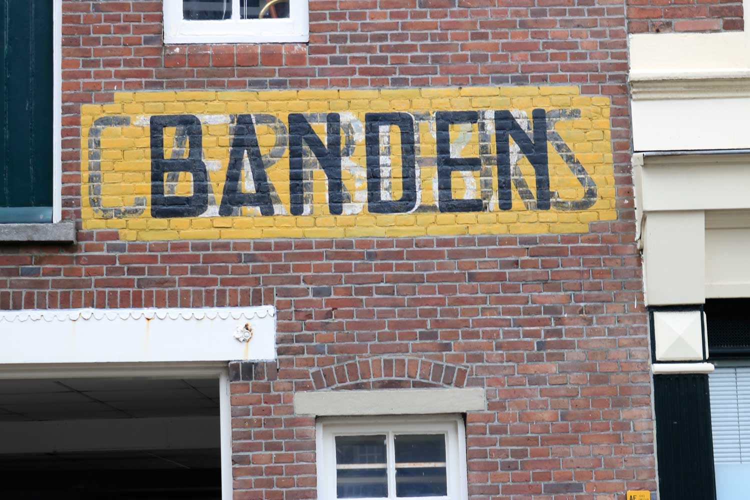 De eerste muurreclame is, gelet op het telefoonnummer van vier cijfers: 6687, waarschijnlijk tussen 1914 en 1924 aangebracht. Het is een reclame in witte letters direct aangebracht op de bakstenen gevel, zoals op de historische foto is te zien. Daarna is er vermoedelijk in de jaren 30 een nieuwe reclame overheen gezet met zwarte letters in een geel kader, een kleur die in die tijd populair was voor muurreclames. Een niet onlogische keuze, want geel kan toch wel gezien worden als een signaal kleur, die de aandacht van het publiek trekt. In de jaren 40 is de reclame in gewijzigde vorm nogmaals aangebracht.
