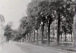Een foto uit 1861. De foto is genomen op de Koninginnegracht richting houten bruggetje over de gracht. Dit bruggetje is de voorloper van de eerste stenen brug; foto: Alexandrine Tinne; Gemeentearchief.