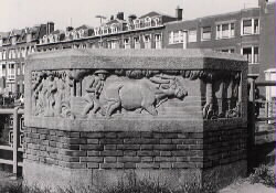 Sculptuur door Gra Rueb voorstellende een fabel van La Fontaine aan de brug bij de Houtweg / Nieuwe Uitleg; foto: A.S.C. Schüller, Gemeentearchief