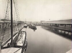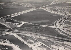 Luchtfoto Groente- en Fruitmarkt in 1929. Linksvoor Laakkanaal en Laakhaven; rechts de Parallelweg
