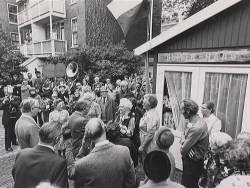 De wethouders A.J. van der Hagen en H.F. Happel bij de opening van het ontmoetingscentrum voor ouderen 'Buiten Haag', een 'bouwkeet' in het tuinencomplex Fronemanstraat-Schalkburgerplein-Scheepersstraat.
